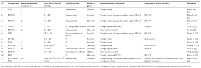 (4) Izadi M, Sadr Hashemi Nejad A, Moazenchi M, Masoumi S, Rabbani A, Kompani F, Hedayati Asl AA, Abbasi Kakroodi F, Jaroughi N, Mohseni Meybodi MA, Setoodeh A, Abbasi F, Hosseini SE, Moeini Nia F, Salman Yazdi R, Navabi R, Hajizadeh-Saffar E, Baharvand H. Mesenchymal stem cell transplantation in newly diagnosed type-1 diabetes patients: a phase I/II randomized placebo-controlled clinical trial. Stem Cell Res Ther. 2022 Jun 20;13(1):264. doi: 10.1186/s13287-022-02941-w. PMID: 35725652; PMCID: PMC9208234.