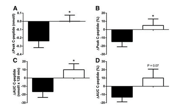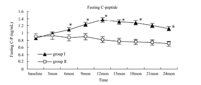 案例二:另有一项完全对照研究,使用患者自体间充质干细胞,一次性静脉滴注自体细胞2.1-3.6×10^6个/kg(中位数2.75×10^6个/kg)。结果证实,患者的C肽水平在一年后得到保留或改善(3)。