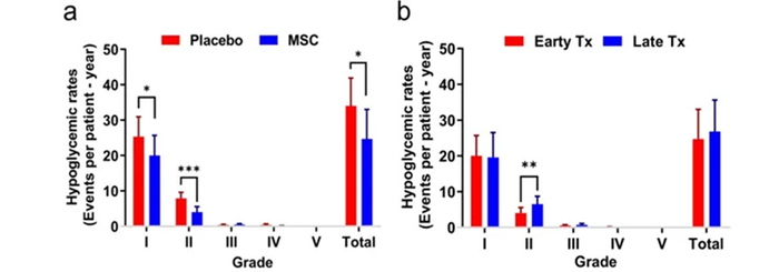 案例三:一项发表在Stem Cell Research &Therapy的随机安慰剂对照临床试验表明,21名Ⅰ型糖尿病患者在接受剂量为每公斤体重1*10^6个自体间充质干细胞的细胞治疗后,有效降低了低血糖发生的频率,这种方法还改善了患者的代谢指标并调节其免疫力反应(4)。