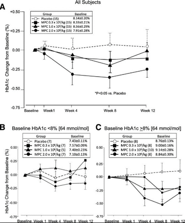 (7) Skyler JS, Fonseca VA, Segal KR, Rosenstock J; MSB-DM003 Investigators. Allogeneic Mesenchymal Precursor Cells in Type 2 Diabetes: A Randomized, Placebo-Controlled, Dose-Escalation Safety and Tolerability Pilot Study. Diabetes Care. 2015 Sep;38(9):1742-9. doi: 10.2337/dc14-2830. Epub 2015 Jul 7. PMID: 26153271; PMCID: PMC4542273.