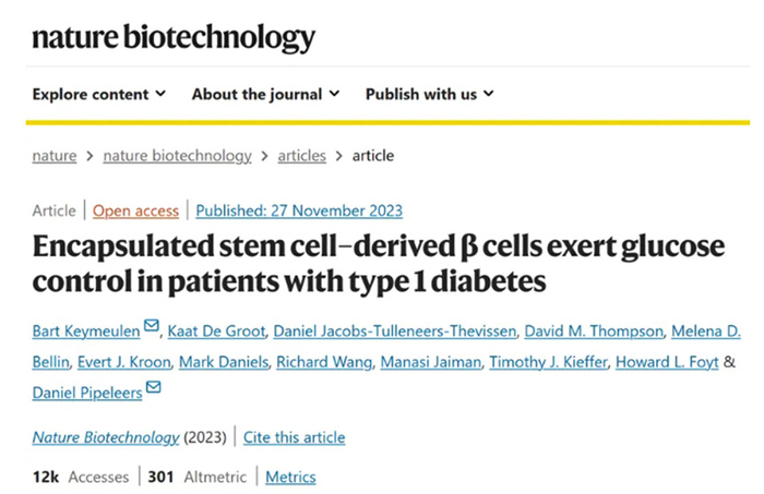 [11] Keymeulen B, De Groot K, Jacobs-Tulleneers-Thevissen D, Thompson DM, Bellin MD, Kroon EJ, Daniels M, Wang R, Jaiman M, Kieffer TJ, Foyt HL, Pipeleers D. Encapsulated stem cell-derived β cells exert glucose control in patients with type 1 diabetes. Nat Biotechnol. 2023 Nov 27. doi: 10.1038/s41587-023-02055-5. Epub ahead of print. PMID: 38012450.
