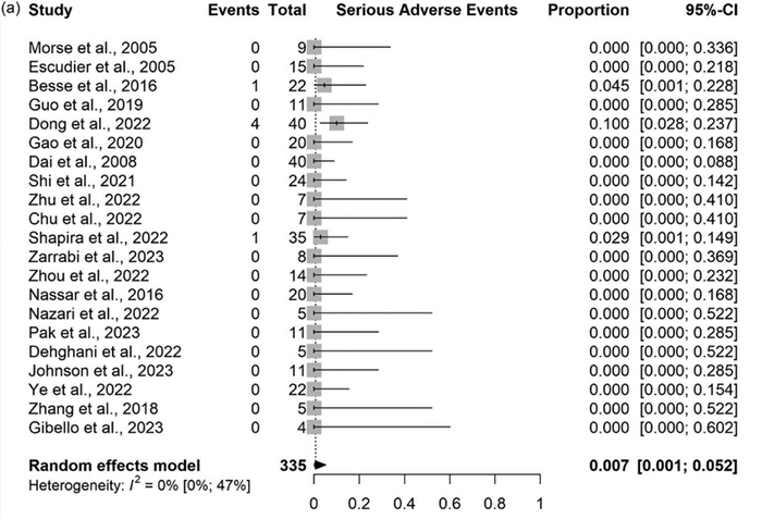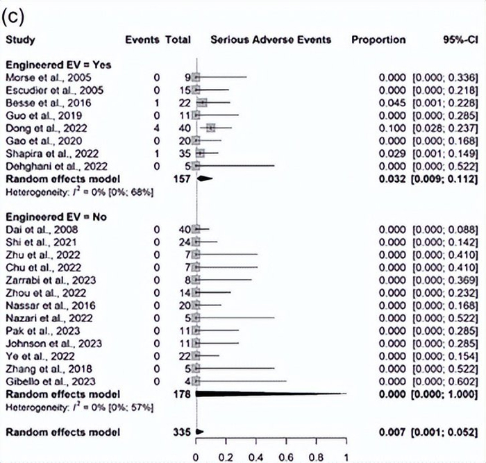在纳入的 21 项研究中,335 名接受细胞外囊泡干预的患者里,整体 SAE 发生率为 0.7%(95% 置信区间:0.1%~5.2%),且研究间异质性极低(I²=0%),说明不同研究的安全数据一致性强。