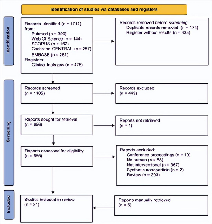 研究团队在 2024 年 1 月,系统性检索了 MEDLINE(PubMed)、Web of Science、SCOPUS、EMBASE 等医学文献数据库,以及 ClinicalTrials.gov、Cochrane 对照试验中心注册库等临床试验平台,共获取 1714 条相关记录。经过多轮筛选,最终仅纳入 21 项符合标准的临床研究。