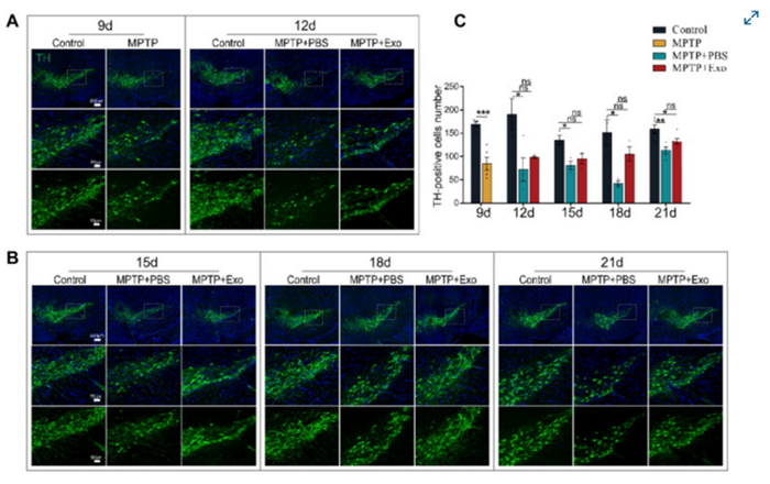 (如下图所示,绿色荧光标记多巴胺能神经元,可见外泌体治疗后多巴胺能神经元密度明显增加)