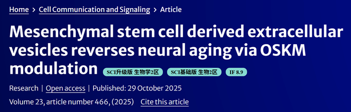 [1] Kim C, Nam SH, Park JH, et al. Mesenchymal stem cell derived extracellular vesicles reverses neural aging via OSKM modulation. Cell Commun Signal. 2025;23(1):466. Published 2025 Oct 29. doi:10.1186/s12964-025-02469-5