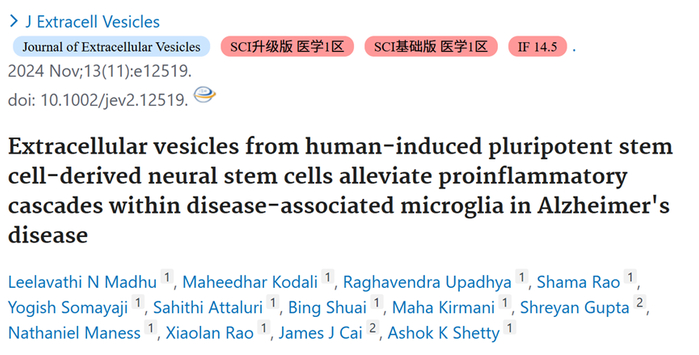 一项研究结果发现干细胞来源的细胞外囊泡能抑制阿尔茨海默病模型中小胶质细胞的促炎反应,减少脑内炎症和斑块沉积。研究者称该疗法或可延缓病程10-15年,可能能显著改善患者生活质量。相关研究结果发表在《Journal of Extracellular Vesicles》上[3]。