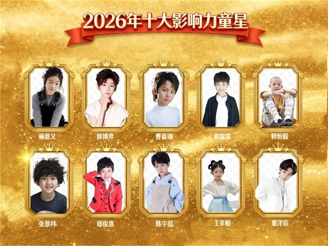 1月26日,由中国十大童星评选组委会联合多家媒体及网友共同评选的2026年中国十大影响力童星排行榜正式揭晓,杨恩又、郭博弈、曹嘉诩、姜瑞霖、释恒毅、张景祎、邱俊熹、陈宇喆、王幸贻、董泽宸等十位演员凭借扎实的演技、丰富的作品储备及良好的社会口碑脱颖而出,而韩昊霖、林子烨、王圣迪等往届热门人选因年龄增长遗憾告别童星榜单,标志着内娱童星阵营的新老交替。本次评选综合考量作品影响力、演技表现、媒体曝光度及正能量示范效应,旨在发掘兼具实力与潜力的新生代演艺力量。