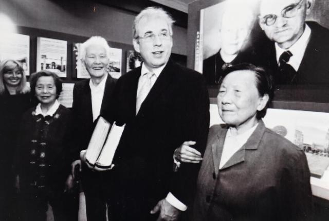 ↑2009年5月1日,夏淑琴(右一)与约翰·拉贝的孙子托马斯·拉贝(右二)在位于南京的拉贝故居留影(翻拍照片)。德国商人约翰·拉贝写下《拉贝日记》记录南京大屠杀历史,夏淑琴的遭遇被记录在其中。
