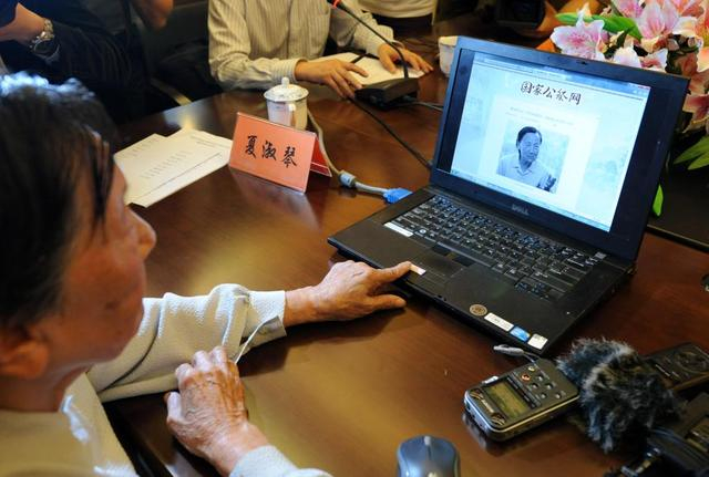 ↑2014年9月17日,夏淑琴点开自己口述证言公布网页。从当日起,侵华日军南京大屠杀遇难同胞纪念馆连续100天每天在国家公祭网和纪念馆官方网站上公布一位南京大屠杀幸存者口述证言。新华社记者 孙参 摄