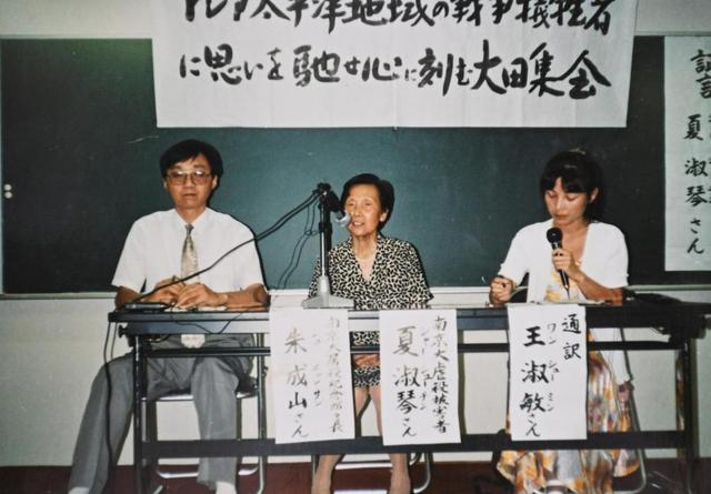 ↑1994年8月6日,夏淑琴(中)在日本举行的集会上提供证言(翻拍照片)。