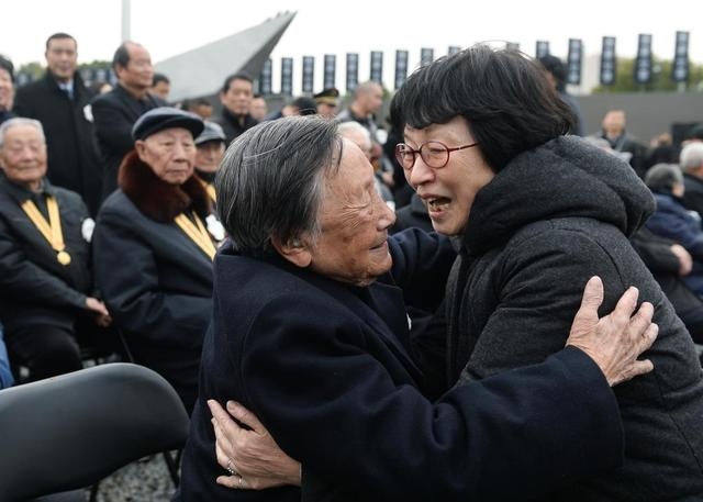 ↑2017年12月13日,南京大屠杀死难者国家公祭仪式开始前,夏淑琴与日本友人松冈环(右)拥抱交流。