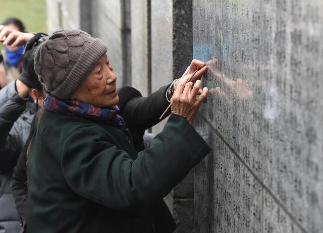 ↑2018年12月10日,在侵华日军南京大屠杀遇难同胞纪念馆举行的死难者遗属家祭活动中,夏淑琴给遇难者名单墙上亲人的名字添漆。新华社记者 孙参 摄