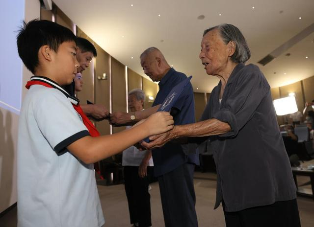 ↑2022年8月15日,在侵华日军南京大屠杀遇难同胞纪念馆,夏淑琴(右一)向曾外孙李玉瀚颁发“南京大屠杀历史记忆传承人”证书。新华社发