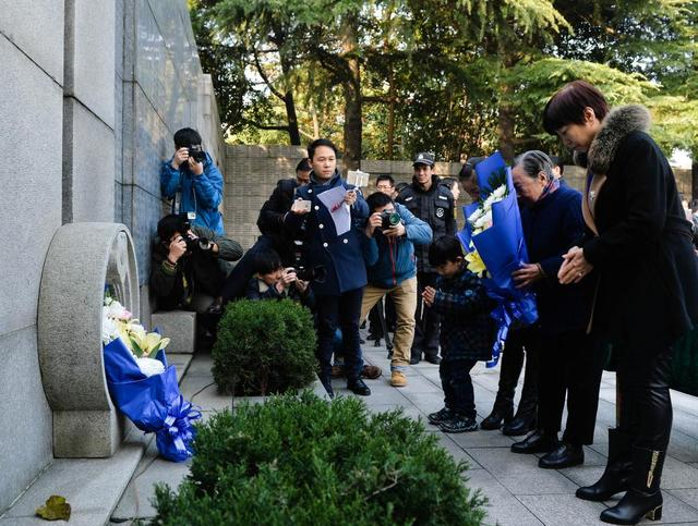 ↑2016年12月3日,夏淑琴(右二)和家人在侵华日军南京大屠杀遇难同胞纪念馆向遇难者献花。