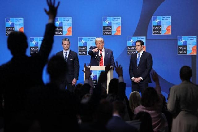 6月25日,在荷兰海牙,美国总统特朗普(中)在北约峰会后出席记者会。新华社记者赵丁喆摄对美伊会谈释放积极信号