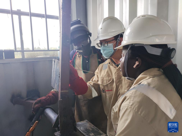 6月16日,在乌干达基贡巴石油学院,中国老师对学员进行针对性辅导。新华社发(中石化供图)在汤海东的指导下,西尔弗的焊缝逐渐变得均匀美观,终于在结业前几天焊出了漂亮的“鱼鳞纹”,不仅通过了第三方机构考核,更收获了汤老师的称赞:“很好!这就是我要看到的焊缝!”
