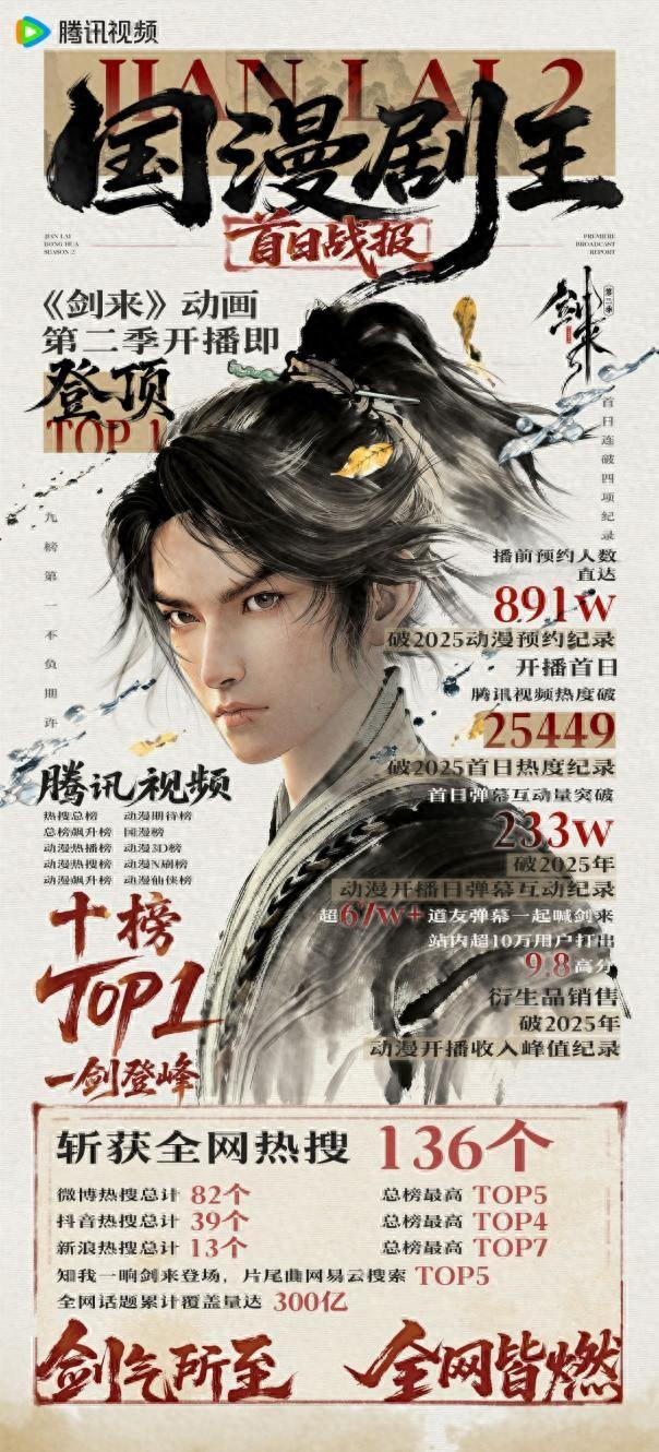 以891万站内预约人数创下国漫预约人数新峰值,12月25日,《剑来》动画第二季正式在腾讯视频全网独播。延续第一季的高热度和高口碑,动画开播后,站内仅16分钟热度即达到20000、11小时突破25000,打破了2025年动漫热度的新记录,并收获了近10万人打出的9.8高分,再次展现了其对于主流年轻观众的影响力。究其原因,除了有独到的“剑气水墨风”带来的东方美学盛宴,更在于这部作品已超越了“国风仙侠”的表层叙事,展现出了植根于中华优秀传统文化的深刻思想与精神风骨。