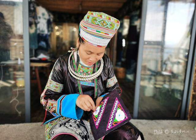 每次外出推介时,刘勤兰都要穿上百鸟衣。她说,希望让更多的人看到苗族服饰之美。“穿着百鸟衣,戴着漂亮的头饰,走到哪里叮叮当当的响,很多人就过来给我拍照。我就要做个‘显眼包’,这样才能慢慢地做成自己的IP,做成自己的一个品牌。”