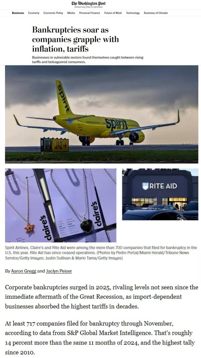 《华盛顿邮报》网站报道截图文章还关注到,美国出现了大型企业破产激增现象,即资产超过10亿美元的企业申请破产。根据美国经济咨询公司基石研究发布的数据,2025年上半年,共有17起此类破产案,创下自2020年以来的最高半年纪录。