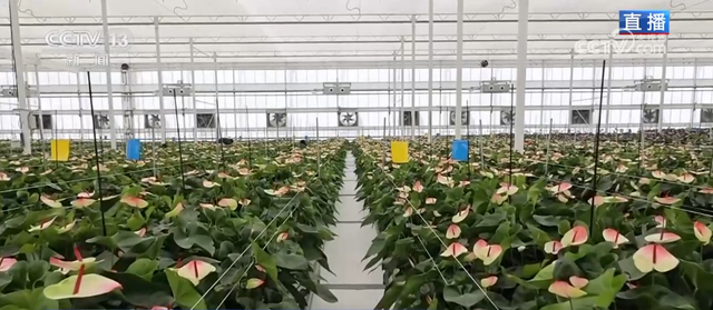现在记者手中这枚类似摊开手掌的植物叫彩掌,它具有瓶插期长、花色饱满、养护简单等特性,并且拥有着鸿运当头、财源涨涨、幸福美满的寓意,因此逐渐成为了年宵花市场的新宠,也是目前该基地主要供应的年宵花品种。值得一提的是,彩掌原本只生长于热带雨林,喜热怕冷,但为何能在中国北方的西安开得花繁叶茂,并且能按照市场需求准时成熟呢?答案就在离记者不远处的这片5万平方米的智能温室里。