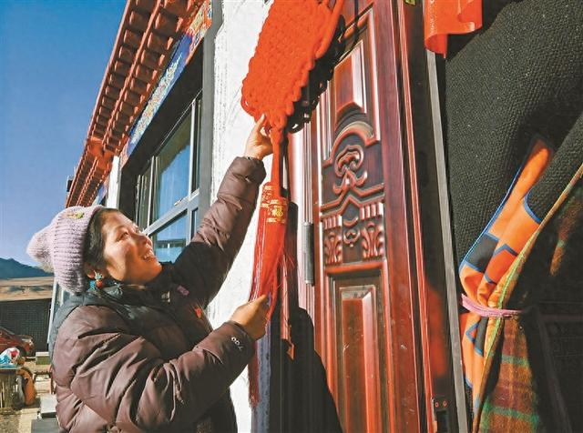 日喀则市定日县协格尔镇奶色姆村村民在新居前挂上中国结。记者 旦增兰泽 摄1月8日,清晨的阳光洒向日喀则市萨迦县雄麦乡扎果村,白玛琼达家的新房子里热气腾腾。她和亲戚围坐在一起,手里的面团被灵巧地捏成各种形状,随即放入热好的油锅,“刺啦”一声,化成了一个个蓬松酥脆的“卡塞”,浓郁的香气立刻在新房中弥漫开来。