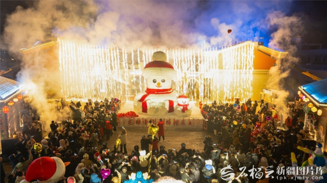 2025年12月27日晚,游客在北屯市龙疆小镇丝路风情街观看烟花瀑布。李正虎摄全域全链服务冰雪游
