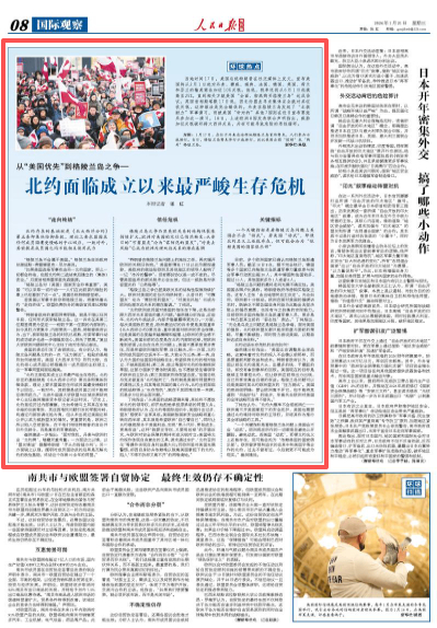 “北约正面临其成立以来最严峻生存危机。北约存在的基础就是《北大西洋公约》第五条即集体防御条款,理论上要求盟国在任何成员国遭受侵略时予以回应,一致对外,其前提是成员国之间不能相互使用武力。”北京外国语大学欧盟与区域发展研究中心主任崔洪建接受本报记者采访时说,“历史上,北约虽经历过内部摩擦,比如希腊与土耳其在东地中海的剑拔弩张、英法因难民问题引发的军舰对峙,均通过内部协调化险为夷,但从未出现过美国这样公开以武力威胁盟友的情况。更重要的是,欧洲之所以陷入空前紧张,在于他们相信特朗普的言论并非外交辞令,而是真实的军事威胁。”