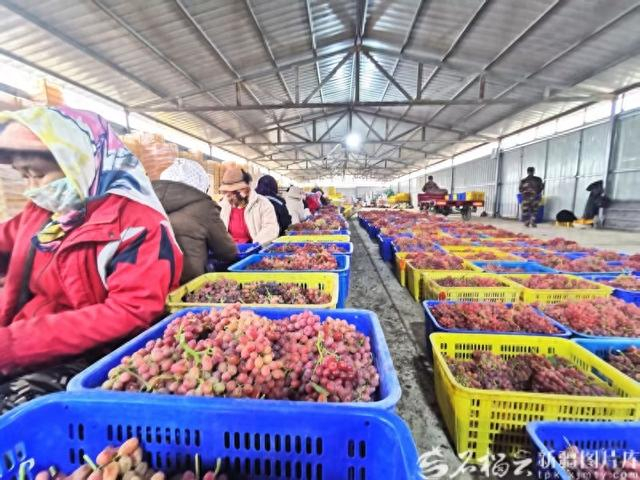 博乐市西域丰农葡萄种植农民专业合作社联合社的分拣车间内,工人们正在分拣葡萄,通过冷链运往国外。(资料图)石榴云/新疆日报记者 曹华摄