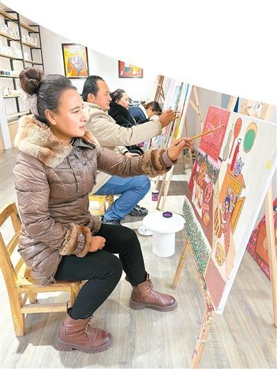 如今,作为非遗传承人和合作社负责人,乃比江肩上的担子更重了。他带着13位农民画家,摸索出“创作—教学—产业”的路子。现在,他们的单幅画作能卖500到1000元,一年下来能创收10万多元。公益培训班里,已有50多名群众拿起了画笔;非遗传承中心内,各地游客通过这些画作,触摸到新疆刀郎文化的脉搏。