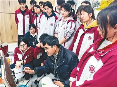 在阿瓦提县文化馆开展的“非遗进校园”活动中,乃比江指导阿瓦提县第八中学(鲁迅高中)学生画画。受访者供图冬日午后,新疆维吾尔自治区阿克苏地区阿瓦提县刀郎文化(农民画)非遗传承中心里,斜阳透过画室的窗户铺洒进来。28岁的乃比江·阿布都热合曼手握画笔,笔尖蘸上一抹颜料,在画板上轻轻勾勒、涂抹,一幅刀郎生活场景图,很快就有了鲜活的轮廓。