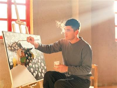 2015年,县文化馆办起了刀郎农民画培训班,乃比江赶紧报了名,拜第三代传承人依力亚斯·巴吾东为师。他从最基础的线条、配色学起,跟着师傅一次次走进田间地头采风。师傅常说“画画要扎根生活”,这句话他一直记在心里。既是农民,也是画者,乃比江干农活之余从没放下过画笔,他的作品《幸福之花》,就定格了母亲和姐姐在棉田里捡棉花时的温馨模样。
