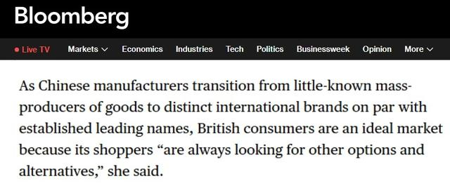 英国天空新闻台网站报道截图彭博社网站的报道指出,相比美国的贸易保护主义政策,英国对中国贸易持开放态度。报道援引中英贸易协会零售和电子商务部门主管唐赛琳(音译)的观点指出,在英国市场,消费者欢迎任何能提供优质产品和物有所值的优秀品牌。她表示,随着中国制造商从鲜为人知的商品生产者转型为与国际知名品牌比肩的独特品牌,英国消费者成为其理想的目标市场,因为当地买家“始终在寻求更多选择和替代方案”。
