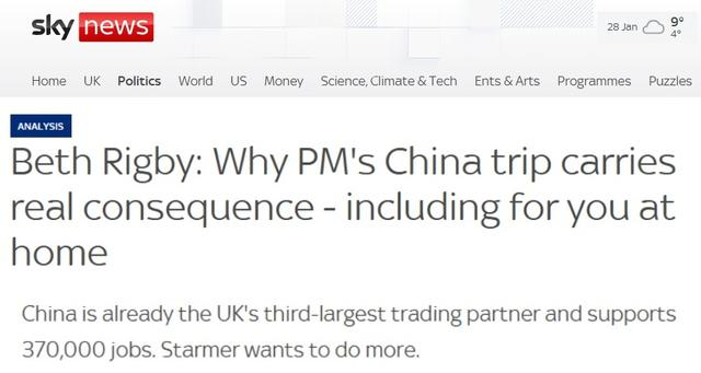 美联社网站报道截图英国天空新闻台网站的报道援引斯塔默行前的表态指出,中国对英国至关重要。作为全球最主要的经济体之一,与中方保持战略稳定关系完全符合英国的国家利益。报道说,中国已是英国第三大贸易伙伴,支撑着37万个就业岗位。斯塔默希望进一步深化合作。同时,中国也希望在投资和出口方面扩大对英国市场的准入。