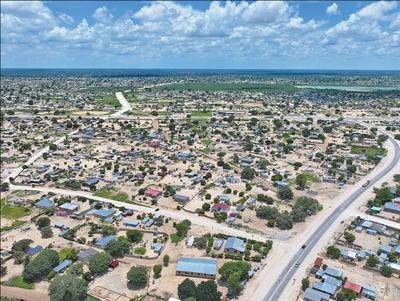 “村村通”项目致力于打通偏远村庄至城镇主干道的“最后一公里”。图为“村村通”项目在纳米比亚实施后,伦杜市图欣吉雷尼村修建了与主干道连通的村道(无人机照片)。汪 强摄
