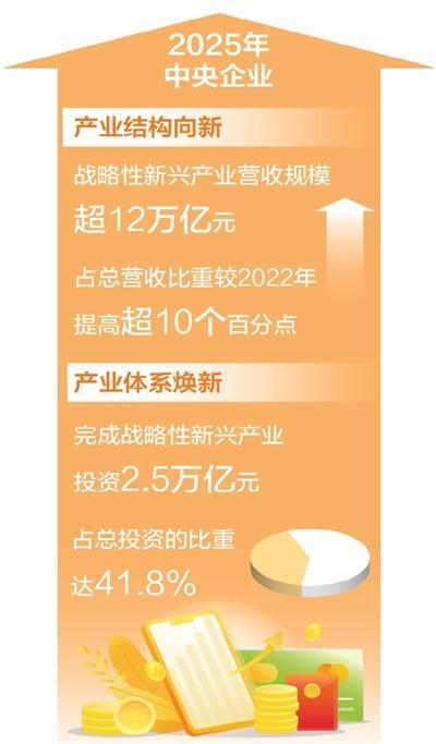 一是,央企战略性新兴产业营收规模超12万亿元,占总营收比重较2022年提高超10个百分点。二是,央企完成战略性新兴产业投资2.5万亿元,占总投资的比重达41.8%。
