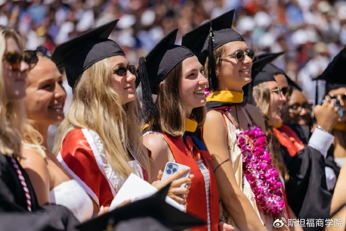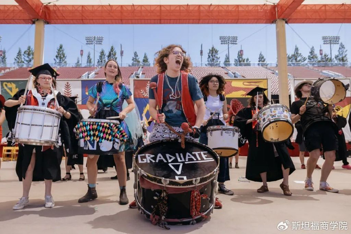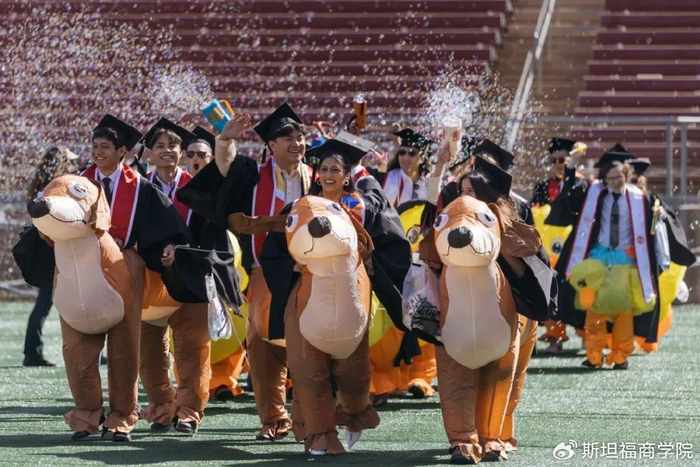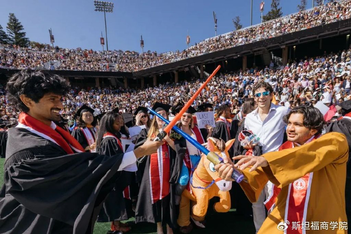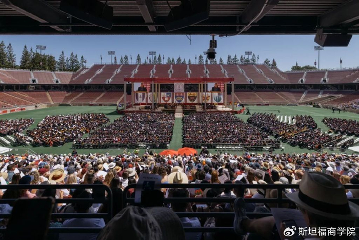 来自全美乃至全球的亲友齐聚一堂,为毕业生领取斯坦福文凭喝彩。许多家庭举着印有毕业生大头像的标语牌,还有的家长身穿“斯坦福妈妈”或“斯坦福爸爸”的T恤。