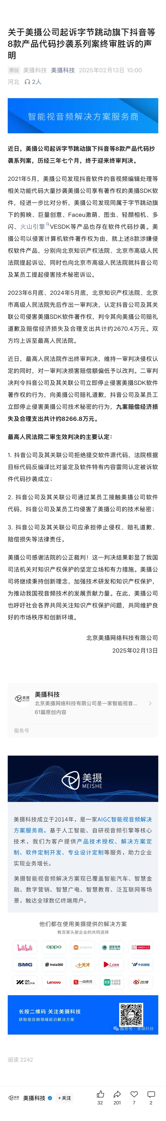 2025 年 2 月 13 日,美摄科技发布《关于美摄公司起诉字节跳动旗下抖音等 8 款产品代码抄袭系列案终审胜诉的声明》。