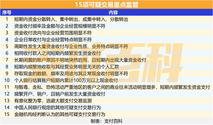 比如《金融机构大额交易和可疑交易报告管理办法》中明确指出的15项可疑交易重点监管条例,短期内资金快进快出,资金收付与经营范围明显不符,频繁开户、销户,且销户前发生大量资金收付等。