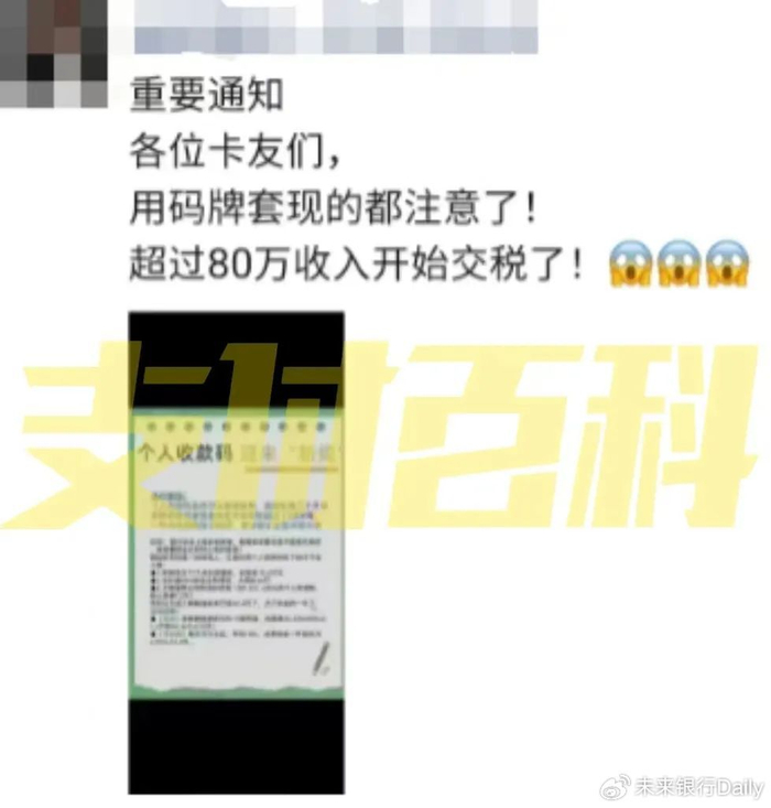该代理商发布的通知上还显示,银行会对收款超过80万的情况进行风控,经发现后会上报税务局对其进行查明,若是个人收款码超过80万不入账的,要缴纳增值税、企业所得税、个人所得税以及偷税罚款、滞纳金等。