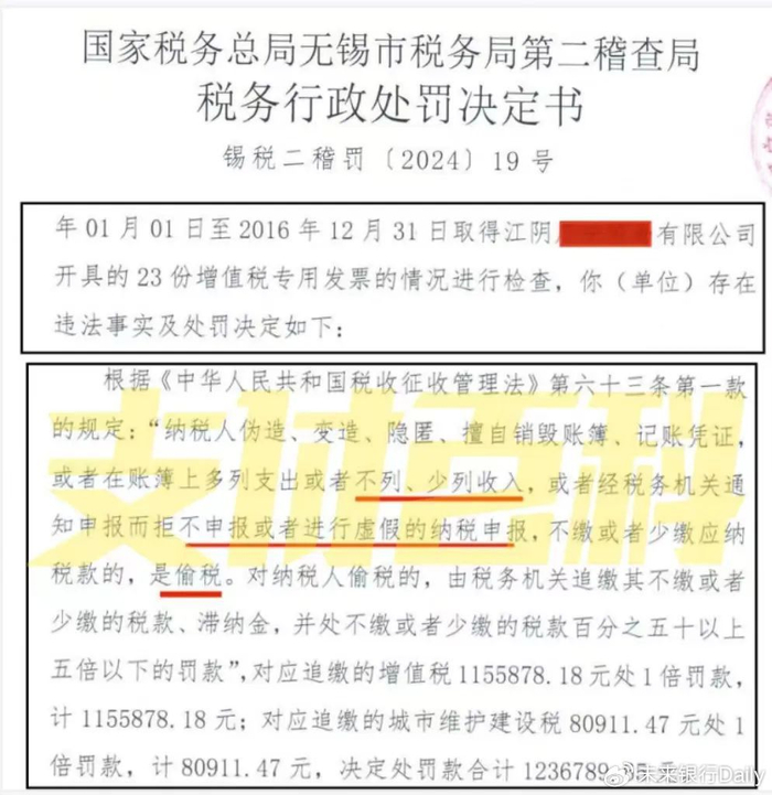 据无锡市税务局第二稽查局公开的行政处罚显示,某公司开具的增值税专用发票存在伪造情况,构成偷税,被处罚除补足应缴税费之外,并处不缴或少缴税款的百分之五十以上或五倍以下的罚款,合计金额123万元以上。
