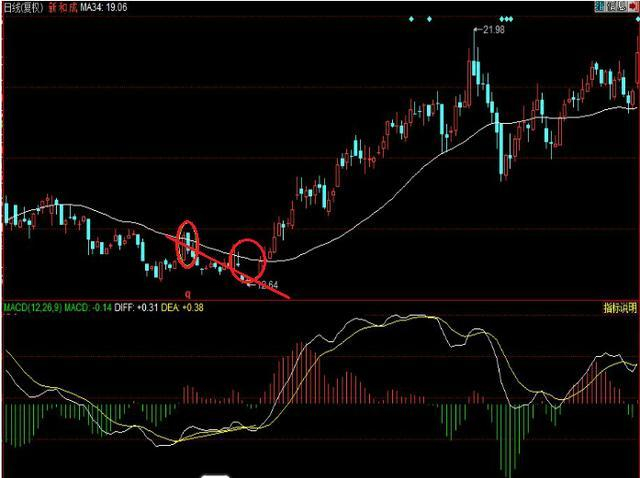 主要看的是股价与均线的关系,如果出现,则能提高成功率,但也不一定要求出现。上图是34日均线在底部附近与股价的关系, 在第二底之前不远处。股价曾经触及均线。 这一特征,加强了底部的可靠性。
