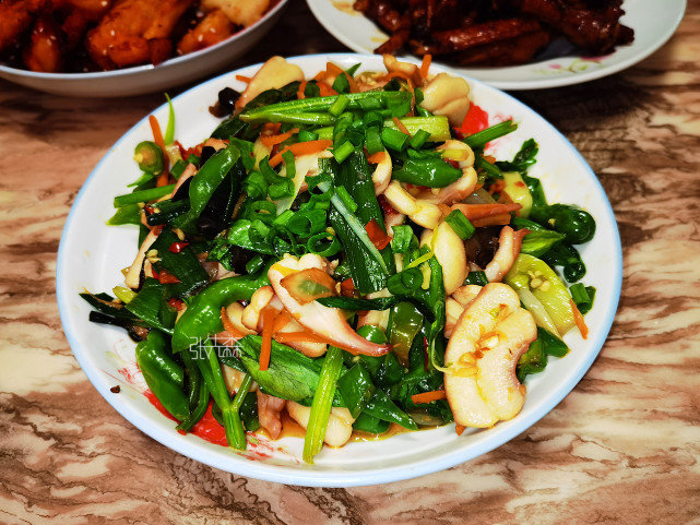 因为不住在海边,海鲜市场不太发达,所以冰鲜其实才算得上我们餐桌上的常客。辣炒鱿鱼在我们当地,不管是餐厅还是小炒店都是特别受欢迎的一道菜。看得出来,表妹做菜还是很注重佐料食材的搭配,不同颜色的食材搭配在一块儿,看着食欲就上来了。