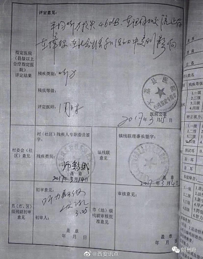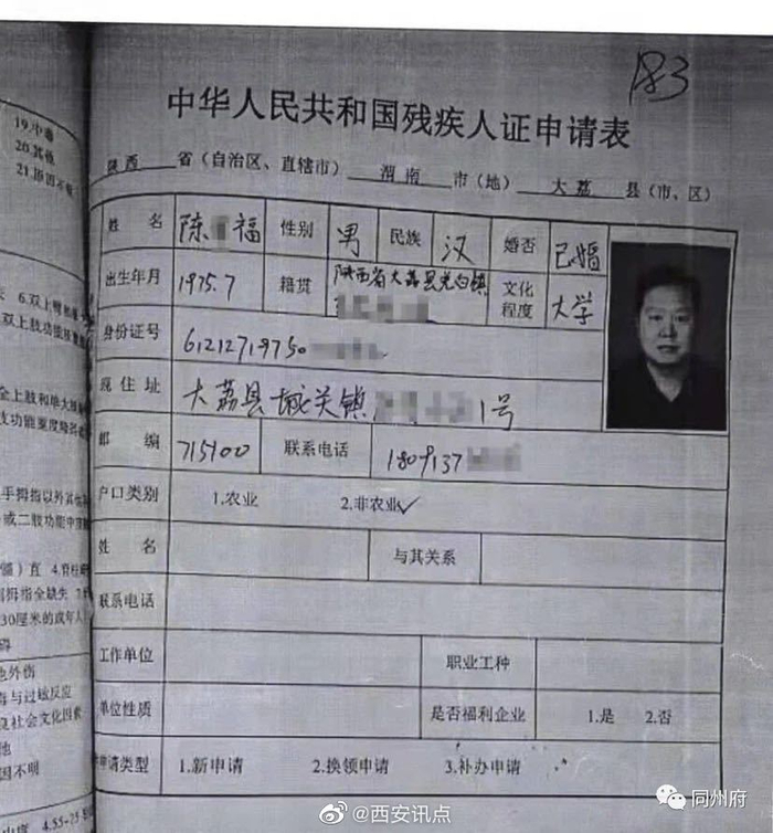 近期,我们的调查人员首先在大荔县残联调取了陈军福的《中华人民共和国残疾人证申请表》(以下简称申请表)、《中华人民共和国残疾评定表》(以下简称评定表)、《残疾人基本登记信息》等材料。