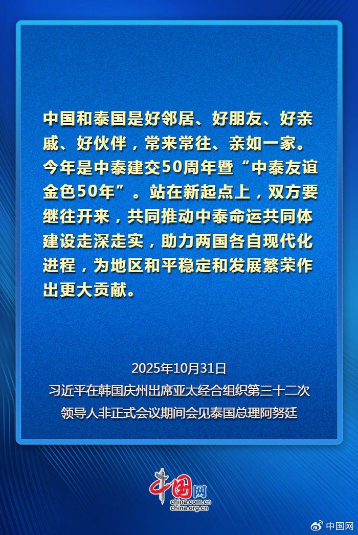 “中泰友好传承千年,‘中泰一家亲’历久弥新”。进入新时代,以习近平同志为核心的党中央秉持亲诚惠容周边外交理念,以元首外交为引领,推动中泰命运共同体建设走深走实。