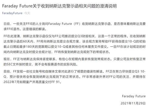 FF回应收到纳斯达克警示函。图片来自FF公众号但FF不得不对指控进行调查,错过了发布财报的时间,并因此收到了纳斯达克的警示函。对此,FF在说明中表示,收到警告函并不意味着纳斯达克要求FF退市,这是错误的解读,并表示一旦FF在该计划规定的时间内向纳斯达克及时提交合规计划,FF将恢复到纳斯达克规则下的常规状态。