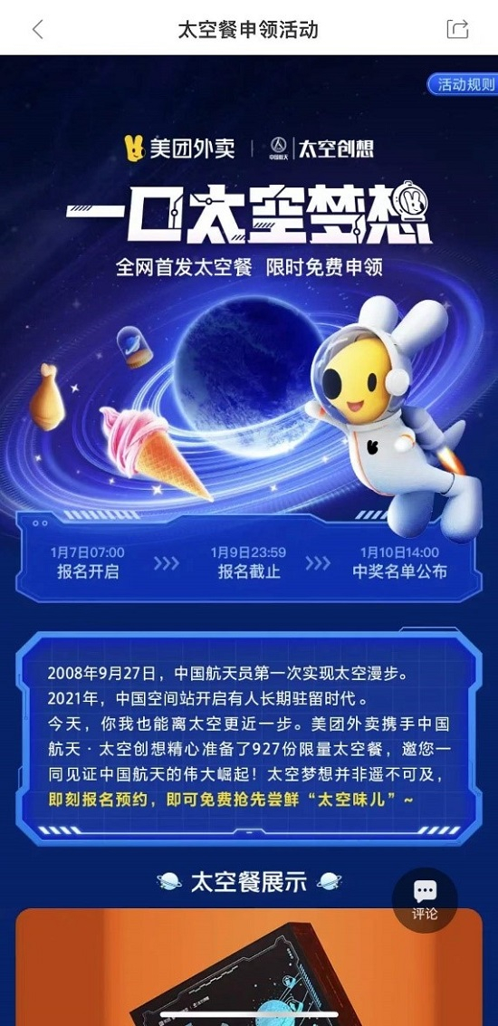 1月7日至1月9日,用户通过美团、美团外卖App进入活动页面报名申领,将有机会获得“太空餐礼盒”。获奖结果将于1月10日腊八当天公布。