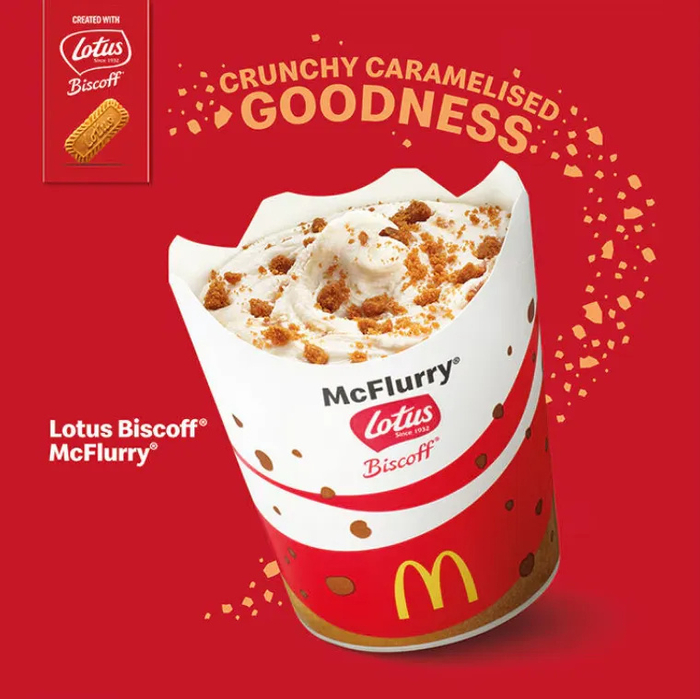 同时,Biscoff也在以饼干为“风味圆心”,通过“配料化”玩法积极拓展产品品类。一方面,Biscoff品牌自身2019年以来陆续推出了饼干碎冰淇淋、夹心巧克力、夹心饼干等新品;另一方面,品牌也和麦当劳、甜甜圈品牌Krispy Kreme、KitKat、亿滋吉百利、哈根达斯等品牌展开了合作,推出添加了Biscoff的麦旋风、甜甜圈、夹心巧克力、冰淇淋等产品,传播“百搭配料”的影响力,也为Lotus Bakeries创造着更多的营收。