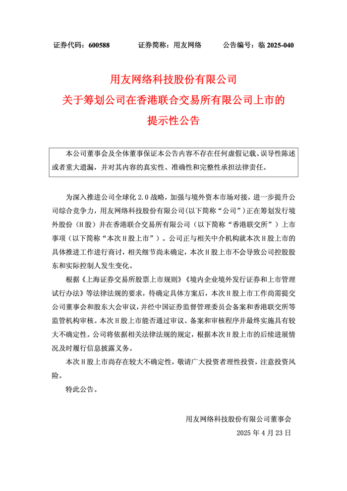 2025 年 4 月 22 日,用友网络科技股份有限公司发布《关于筹划公司在香港联合交易所有限公司上市的提示性公告》。