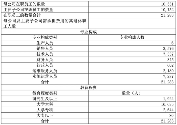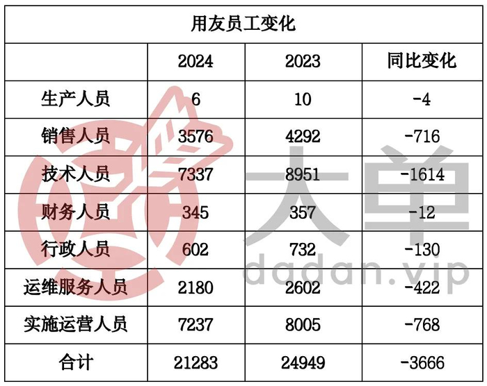 报告期内,用友进一步优化业务组织,继续控制人员规模、优化人员结构。报告期末,员工数量为 21,283 人,较 2023 年末减少 3,666 人。