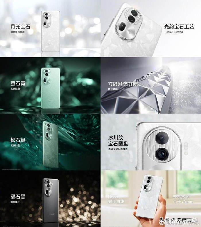 比如在外观设计方面,OPPO Reno11的月光宝石配色、采用了创新的光韵宝石新工艺,将星光、珠光、月光融为一体,镜头处则是采用了冰川纹宝石圆盘的设计,呈现出丰富的层次感,同时镜头周围还加入了巴黎饰钉圈,诠释了全新的潮流美学设计。另外OPPO Reno11系列还拥有萤石青、松石绿以及曜石黑三种配色,分别寓意着“健康”能量、“财富”升级和“事业”上升。